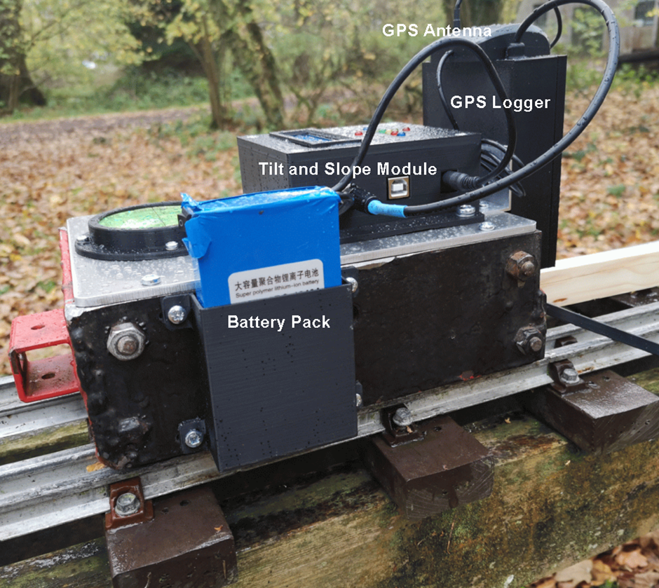 A surplus to requirements bogie was found in the club carriage shop. This had significant mass to make a stable measurement platform. The tilt meter, GPS unit and battery pack were mounted onto the bogie and for further visual cross checking a bubble level gauge was included. Here are some images (wet images …)