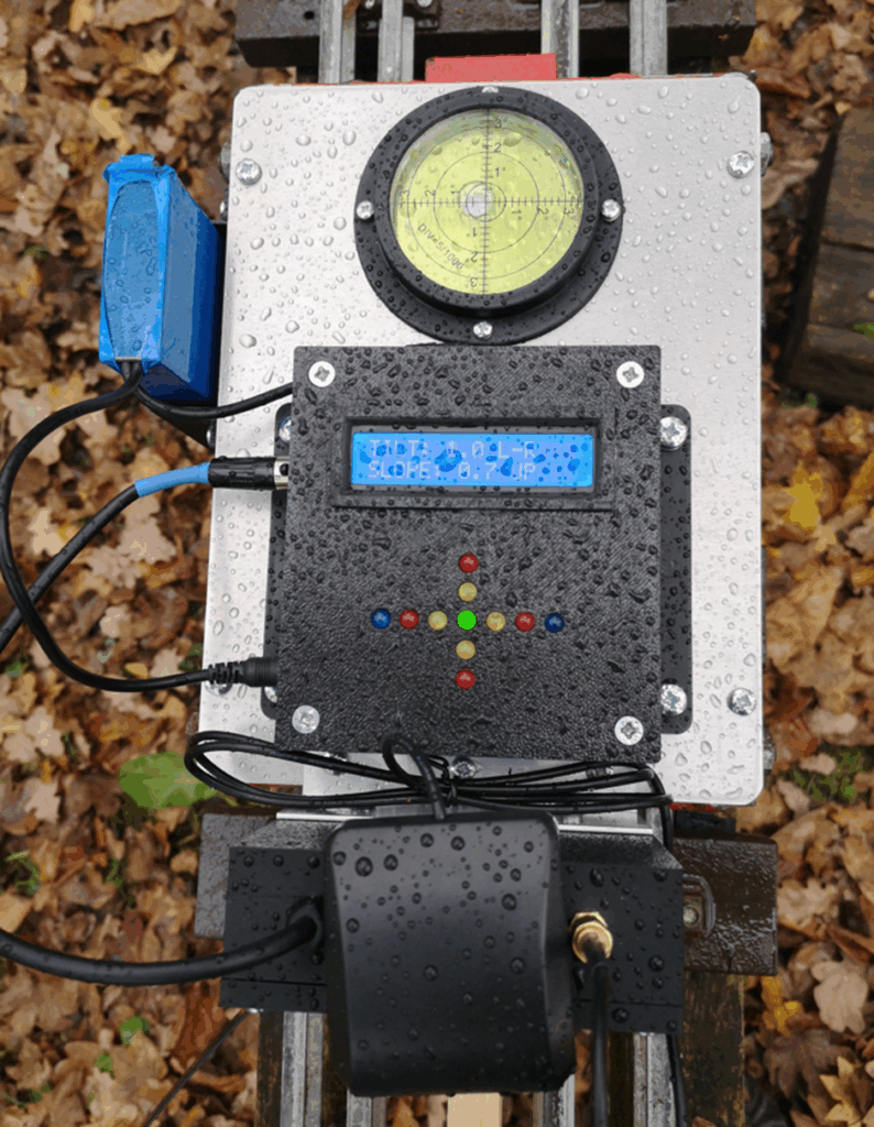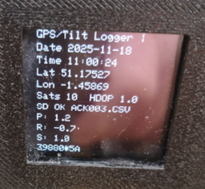 Mission creep alert …. I decided to add a GPS facility so the readings around the track could be logged. I added an OLED display and also a memory card facility to record the results for future reference. The code runs on a Seeed Xiao. The GPS unit was housed in a separate 3D printed enclosure and connected via a three wire interface cable. A 3D printed battery holder for a 12V battery completed the installation. The GPS unit takes the slope and tilt information and adds this to the displayed data. Here are Fusion graphics of the LED shield that plugs into the UNO and the GPS receiver and display.