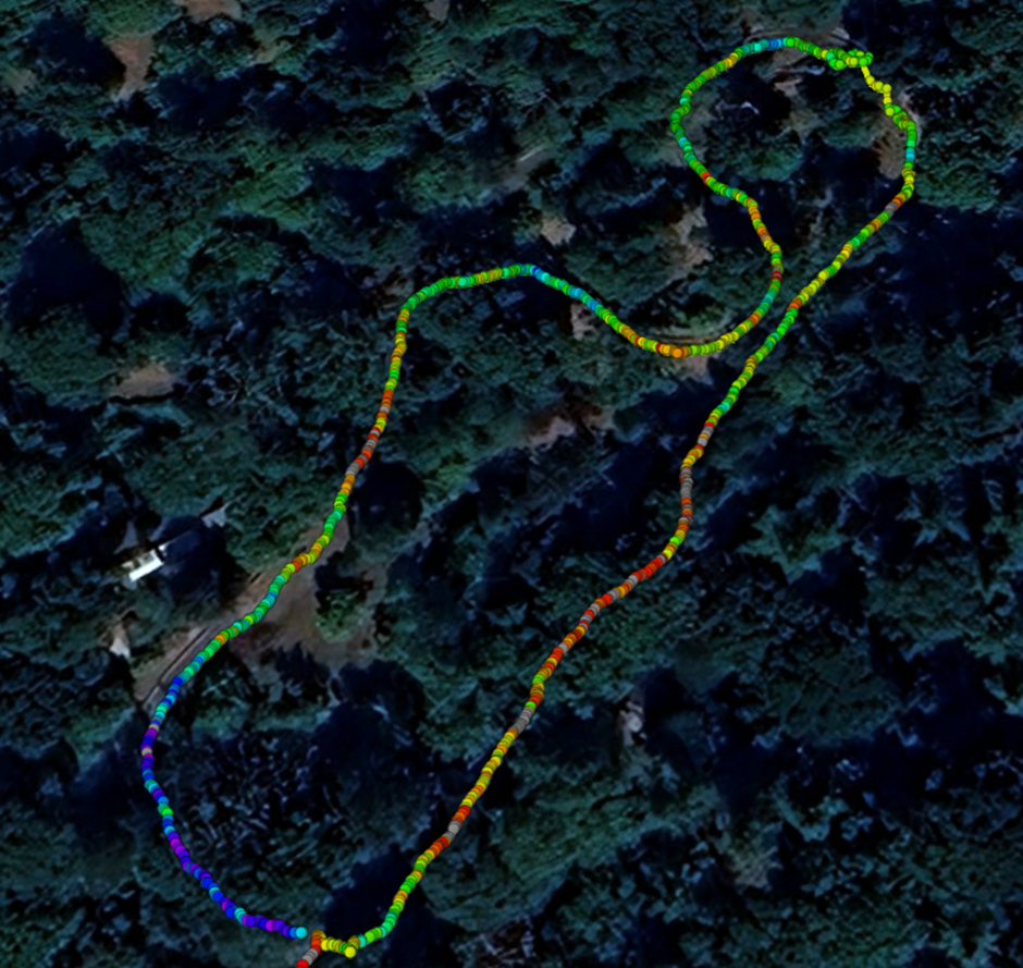 A couple of runs (actually very slow walks) were made around the track. The logged results were very impressive and highlighted one or two suspect cambers on the track. Using an App called GPS Visualizer it was possible to take the logged results and superimpose them as a snail trail on Google Earth. Visualiser also colour grades the results to provide a more obvious display of the track variations.