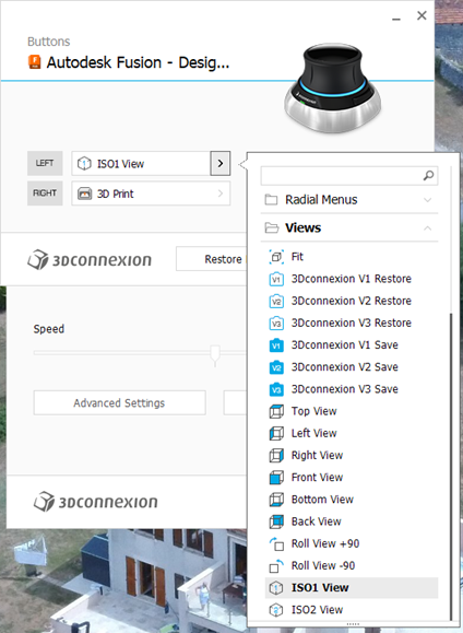 To set up the buttons you need to be in the Fusion Design screen. The 3DConnexion software ‘knows’ what application you are using and which module in the application so this is important. In a wider sense this allows the SpaceMouse to be customised specifically to every application you are using on your machine. (Google Earth fly-by is fun with the SpaceMouse).