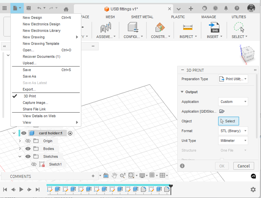 If I right click the SpaceMouse button this takes me to the 3D print submenu in Fusion. This is the same as clicking on the File menu in Fusion and clicking 3D Print. This will bring up the following 3D print sub-menu.