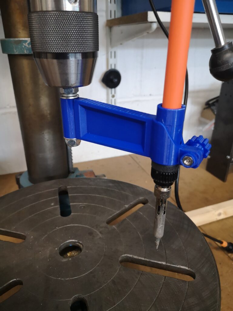 The result end up being quite simple. A soldering iron mounted on an arm that has an arbor for mounting in the drill press chuck. Here is a garishly coloured Fusion graphic image.
