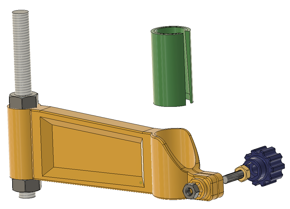 The arbor is a length of M8 studding held firmly in the mounting arm with a top and bottom nut. The soldering iron clamp holds an adapter sleeve to match the soldering iron profile. The clamp is tightened with a 3D printed knob which has a retained M4 nut and thread and this mates with a retained nut in the 3D printed arm.
