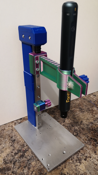 I recently made a modified version of the 3D printed JSK soldering iron brass insert press. The JSK design is well thought out, is rigid, spring loaded and works very well. (Note that I had to print the column in two sections as my Qidi X Smart build volume was too small). I made a revised gripping sleeve for the press to grip the Fanttik so the press now acts as a mini drill stand for small diameter holes such as on PCBs. The run out on a 0.8mm drill bit was not visible to the eye. Here’s the finished press. Excuse the perforated base plate – you have make use of what is functional and to hand.